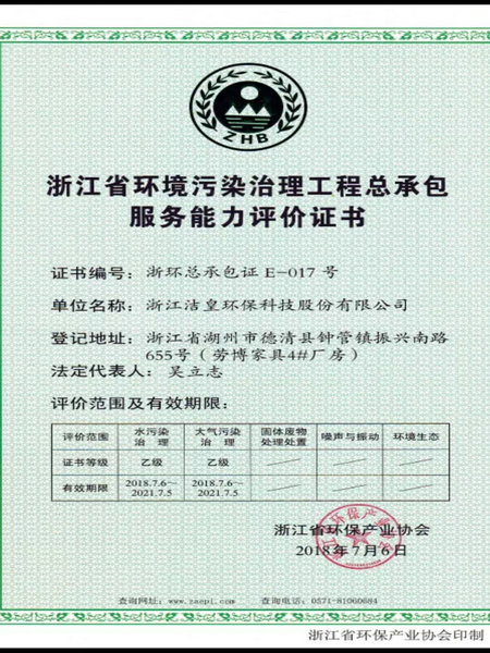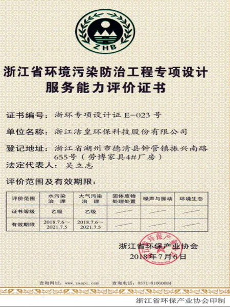 公司研发制造基地位于浙江省湖州市德清县钟管镇振兴南路655号,占地60亩,建筑面积20000㎡,拥有“鑫洁皇”品牌商标,具有污染治理专项设计和工程总承包资质能力、CEP认证以及多项实用新型发明专利。